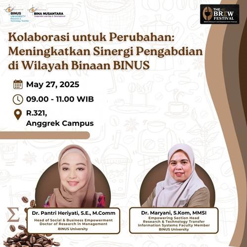 Jakarta, 27 Mei 2025 – Dalam upaya memperkuat kontribusi nyata bagi masyarakat, BINUS University menyelenggarakan pelatihan kolaborasi bertajuk “Kolaborasi untuk Perubahan: Meningkatkan Sinergi Pengabdian di Wilayah Binaan BINUS”. Acara ini dilaksanakan pada 27 Mei 2025 di Ruang 321, Kampus Anggrek, dan menghadirkan para pakar untuk membahas pendekatan inovatif dalam memberdayakan wilayah binaan universitas.