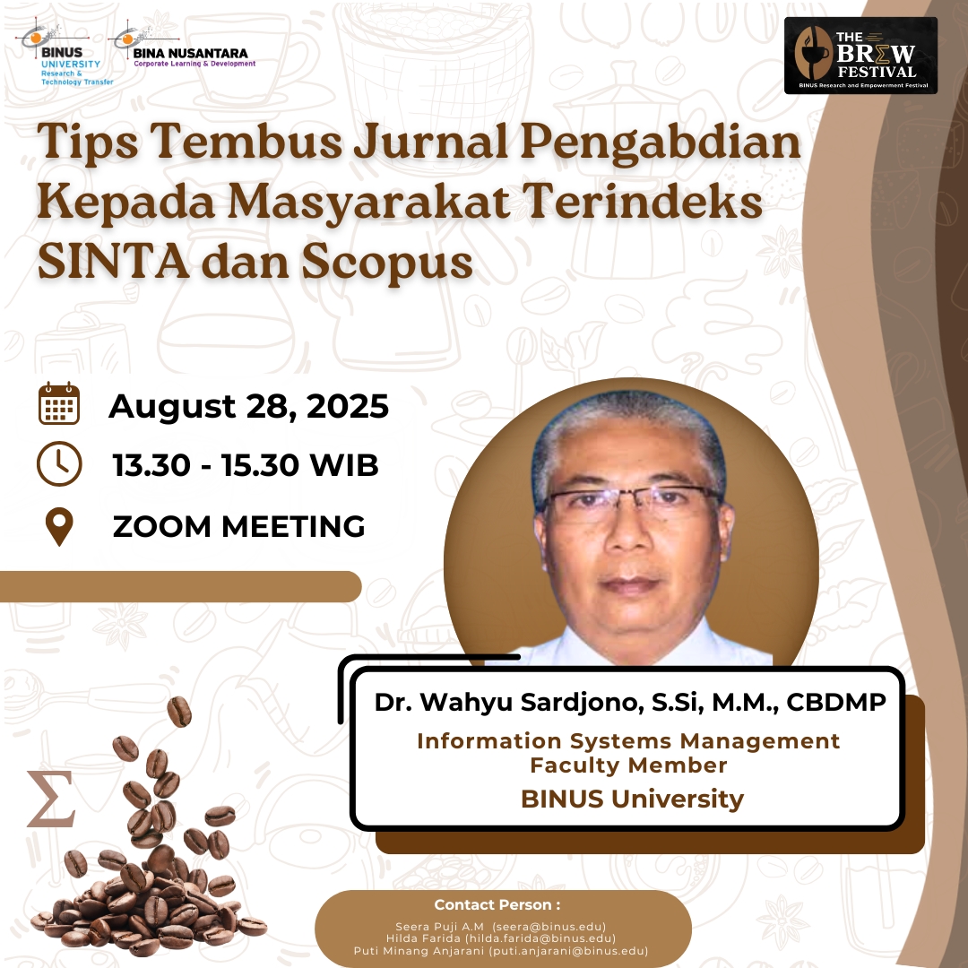 Webinar ini merupakan bagian dari komitmen BINUS University dalam mendukung dosen untuk menghasilkan luaran pengabdian yang tidak hanya berdampak sosial langsung, tetapi juga memiliki nilai akademik tinggi dan dapat diakui secara luas.