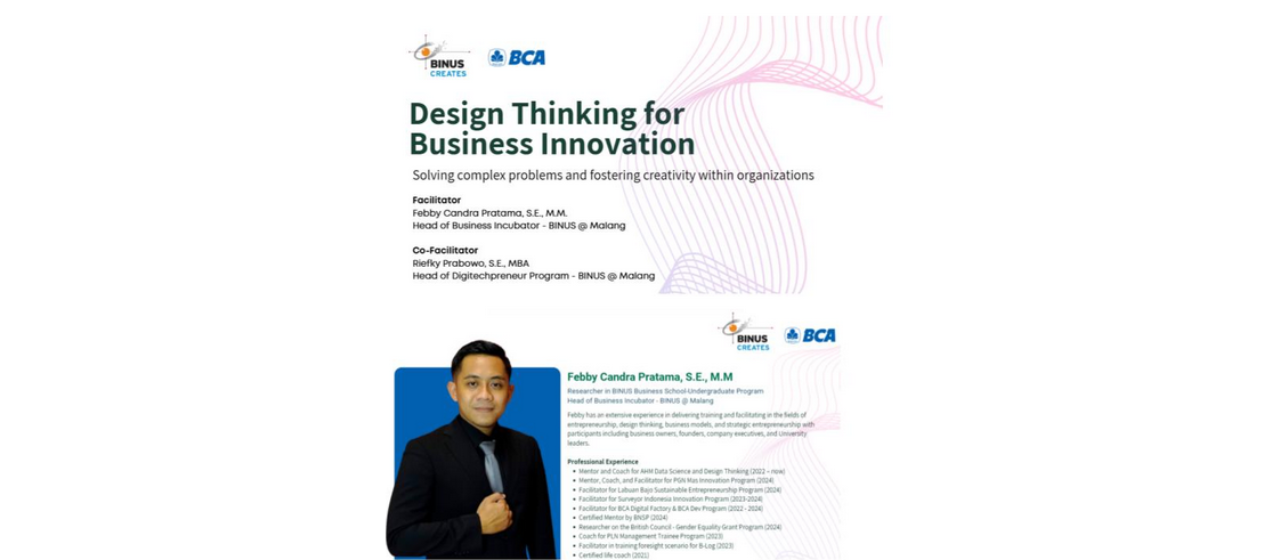 Di tengah dinamika dunia bisnis yang terus berubah, kemampuan untuk berinovasi bukan lagi pilihan, melainkan kebutuhan esensial. Memahami hal ini, Program Community Empowerment BINUS University berkomitmen menjembatani pengetahuan akademis dengan kebutuhan praktis di masyarakat. Salah satu wujud nyatanya adalah kegiatan pengabdian masyarakat bertajuk “Design Thinking for Business Innovation: Solving Complex Problems and Fostering Creativity within Organizations”. Dilaksanakan oleh Bapak Febby Candra Pratama, S.E., M.M., Dosen dari Jurusan Kewirausahaan BINUS Business School, kegiatan ini mengambil bentuk workshop yang secara khusus menargetkan peserta dari BCA Leadership Program.