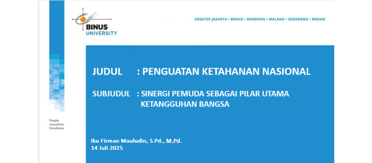 Di tengah derasnya arus tantangan global, ketahanan nasional bukan lagi sekadar urusan negara, melainkan tanggung jawab kolektif yang berakar dari denyut nadi komunitas. Inilah semangat yang melatarbelakangi Program Kemitraan Masyarakat “Penguatan Ketahanan Nasional: Sinergi Pemuda sebagai Pilar Utama Ketangguhan Bangsa” yang diinisiasi oleh dosen BINUS University. Program ini merupakan perwujudan nyata dari komitmen BINUS melalui Character Building Development Center dalam menciptakan generasi muda yang tidak hanya unggul akademis, tetapi juga berintegritas tinggi dan berwawasan kebangsaan. Lebih dari sekadar pelatihan, kegiatan ini adalah sebuah jembatan yang menghubungkan pengalaman akademis perguruan tinggi dengan potensi lokal Desa Jayamekar, menempatkan pemuda—khususnya Karang Taruna—sebagai agen perubahan dan fondasi utama ketangguhan bangsa.