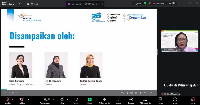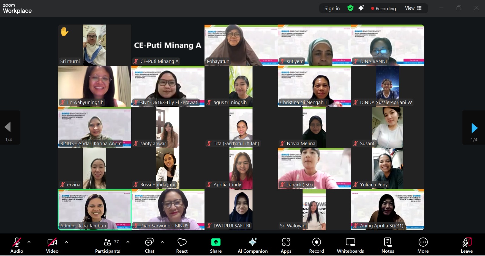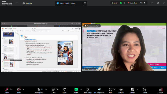 Menjawab kebutuhan tersebut, Community Empowerment BINUS University menghadirkan program “Empowering Voices: Public Speaking Program for Migrant Domestic Workers in Singapore” yang berlangsung pada 18 dan 25 Januari serta 1 dan 8 Februari 2026 secara daring. Selama empat pertemuan, para MDW Indonesia di Singapura belajar membangun kepercayaan diri, mengelola kecemasan saat berbicara, mengatur suara dan bahasa tubuh, menyusun cerita personal, hingga berlatih berbicara tegas dalam situasi negosiasi. Pendekatan yang digunakan bersifat partisipatif, menggabungkan diskusi, latihan praktik, dan simulasi. Sehingga peserta tidak hanya memahami teori, tetapi mengalami langsung proses penguatan diri melalui praktik nyata.