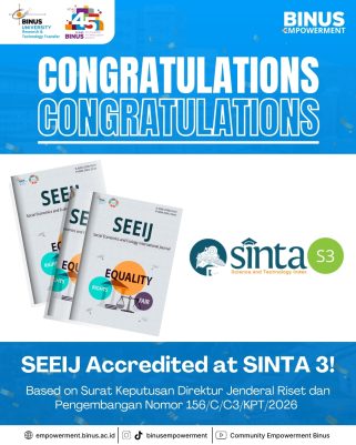 With great pride, Community Empowerment (CE) BINUS University announces that the Social Economics and Ecology International Journal (SEEIJ) has officially been accredited SINTA 3 based on the Decree of the Director General of Research and Development Number 156/C/C3/KPT/2026.
