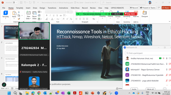 Kegiatan ini didampingi oleh Andika Hairuman, S.Kom., M.Kom, Faculty Member Information System BINUS Online Learning. Dengan pendekatan edukatif dan interaktif, webinar menghadirkan pengalaman belajar yang tidak hanya berisi teori, tetapi juga praktik langsung. Peserta diperkenalkan dengan berbagai reconnaissance tools seperti httrack, nmap, wireshark, nessus, hingga netcat, sekaligus memahami bagaimana penggunaannya dalam konteks ethical hacking.
