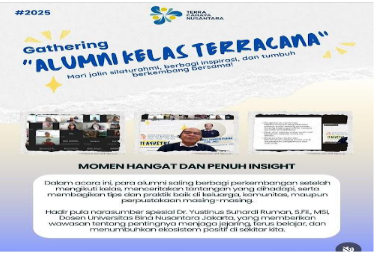 Acara puncak dari kegiatan yang mengusung tipe BINUS Bangun Desa-Gov ini adalah sebuah gathering yang hangat dan penuh inspirasi, yaitu “Alumni Kelas Terracana.” Dilaksanakan secara daring melalui Zoom pada tanggal 13 Agustus 2025, momen ini menjadi wadah bagi para alumni untuk saling berbagi perkembangan, tantangan, dan praktik baik dari komunitas dan perpustakaan mereka masing-masing. Ketua Tim Pengusul, Bapak Yustinus Suhardi Ruman, turut hadir sebagai narasumber, berbagi wawasan tentang pentingnya terus belajar, dan bagaimana menyebarkan energi positif di lingkungan mereka. Interaksi yang terjalin menciptakan sinergi emosional yang kuat, membuktikan bahwa meskipun dilakukan secara virtual, semangat kebersamaan dalam membangun negeri tetap membara.