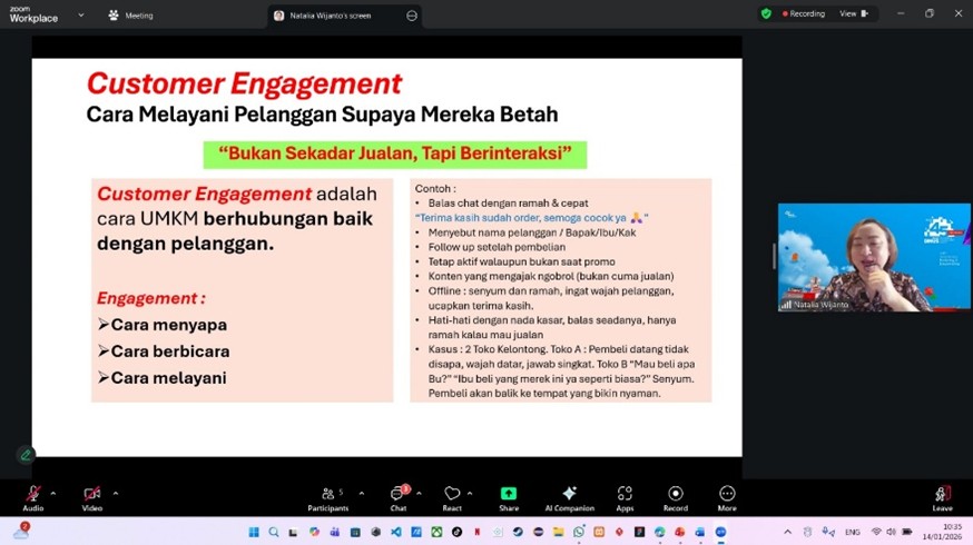 Kegiatan pengabdian dilaksanakan pada 14 Januari 2026 dan bertempat di BINUS University Bandung Campus melalui Zoom Meeting, sehingga memungkinkan partisipasi UMKM secara fleksibel dan efektif. Selama kegiatan berlangsung, peserta mengikuti sesi pemaparan materi, diskusi interaktif, serta pendampingan yang diarahkan pada permasalahan nyata yang dihadapi UMKM dalam mengelola pelanggan dan data usaha.